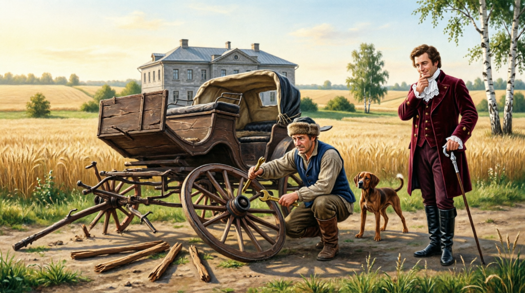 – Вижу, барин. Ось полетела, да спицы менять надо.